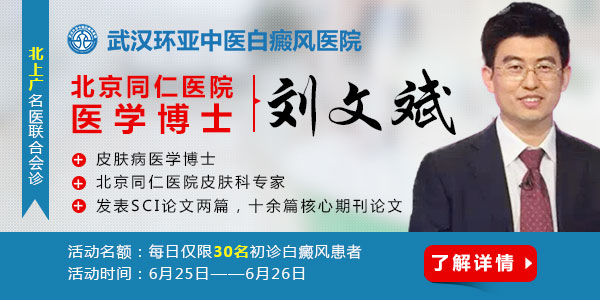 6月25日是世界白癜风日,全国各地开展每年一度的白癜风优质专家巡诊活动。作为湖北地区专业的白癜风中西医结合诊疗医院——武汉环亚中医白癜风医院,依托北京的优质医疗平台,特邀北京同仁医院专家、白癜风医学博士刘文斌主任亲临武汉环亚,6月25日—6日26日开展为期两天的大型疑难白癜风专家联合会诊活动。让患者不出家门,即可享受北上广名医会诊。名额有限,预约从速!
